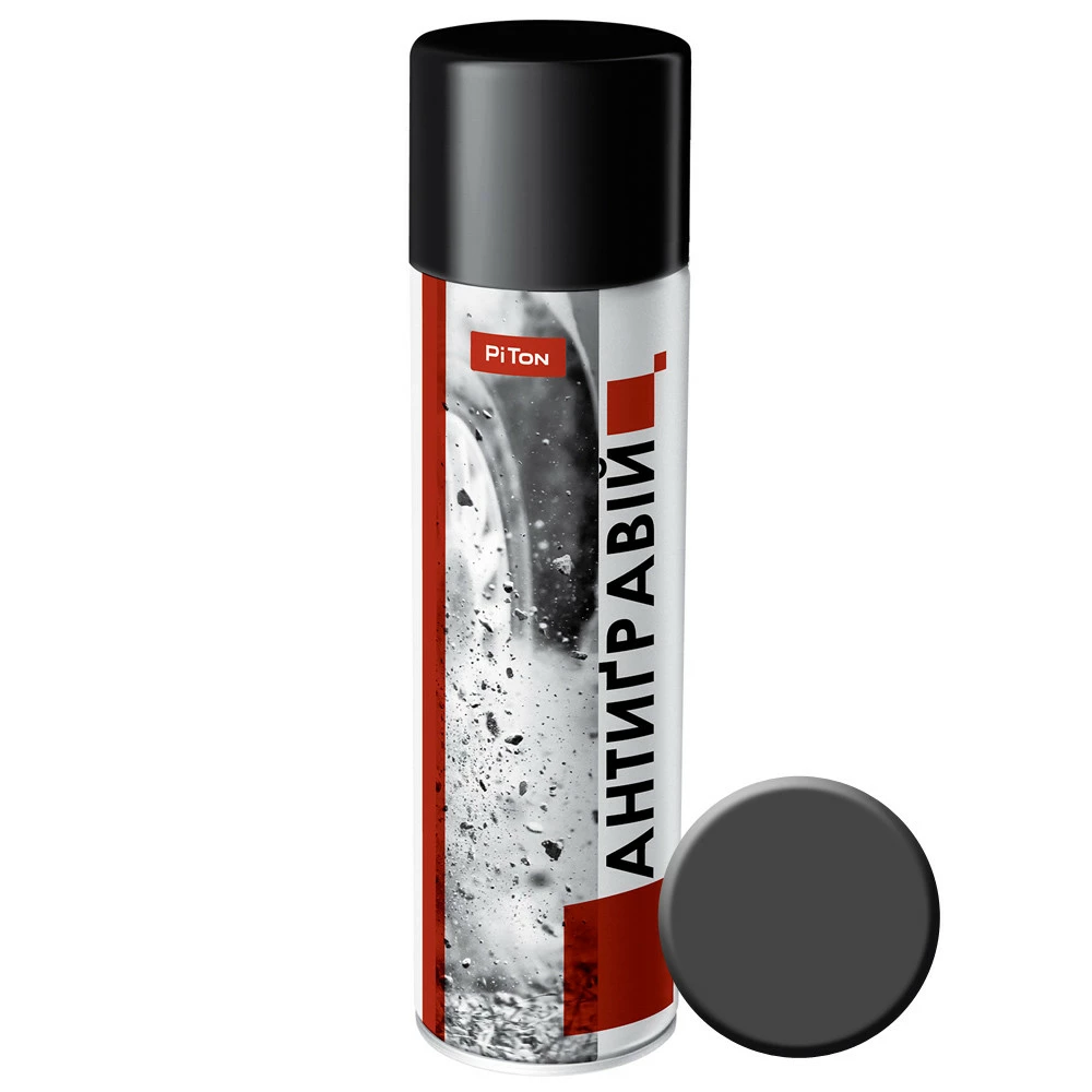 Антигравий PITON — эластичное антикоррозийное покрытие на основе высокополимерного каучука и синтетических смол. Используется для обработки кузова автомобиля: порогов, спойлеров, колёсных арок, передних и задних фартуков, нижней части дверей и других деталей. Существенно продлевает срок службы кузова. Окрашивается любыми видами лакокрасочных материалов. Цвет крышки приблизительно соответствует цвету «антигравия» в баллоне. Площадь покрытия в зависимости от толщины слоя составляет 2,5–3 м2. Время полного высыхания 2 часа при температуре +20°C.
