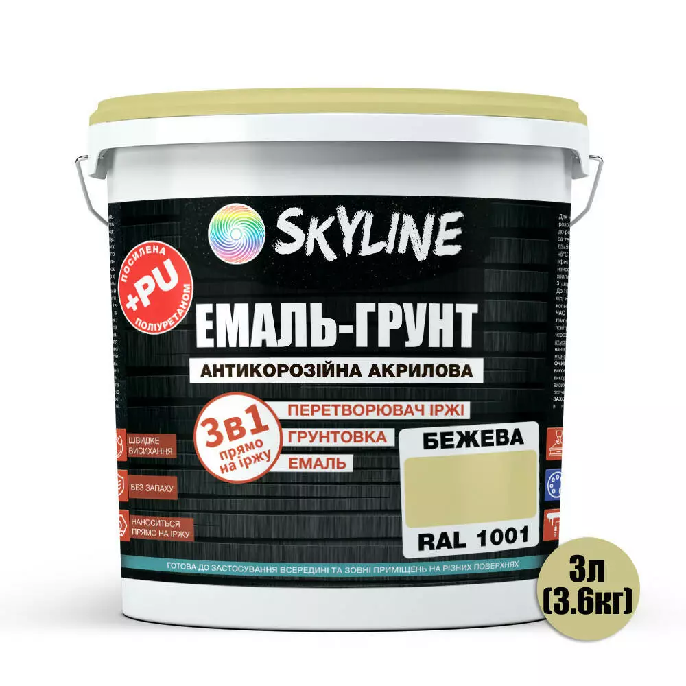 ЭМАЛЬ – ГРУНТ 3 в 1 акрил-полиуретановая шелковисто-матовая Skyline RAL 1001 Бежевая 3,6 кг