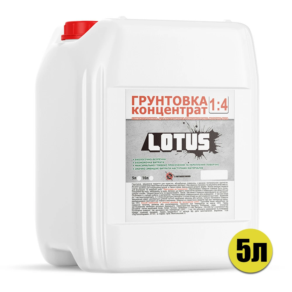 Грунтовка концентрат 1:4 "LOTUS" предназначается для обработки и укрепления цементных штукатурок, гипсокартонных и гипсовых поверхностей, бетонных оснований, а также волокнисто-цементных поверхностей, строительных смесей, шпаклевок перед любой последующей отделкой: шпаклевкой, поклейкой обоев, покраской.