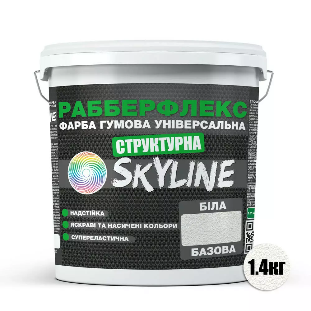 Краска резиновая *Структурная* универсальная «РабберФлекс» СкайЛайн (RubberFlex SkyLine) для применения снаружи и внутри помещений, обладающая повышенной стойкостью к механическим и атмосферным воздействиям, выдерживает любые перепады температур, стойкая к воздействию ультрафиолета и инфракрасного излучения. Обладает высокой паропроницаемостью. Приятна в работе, легко наносится, не растекается и не разбрызгивается. Имеет насыщенную однородную консистенцию. Высокоэластичный материал с отличной адгезией к любым поверхностям.