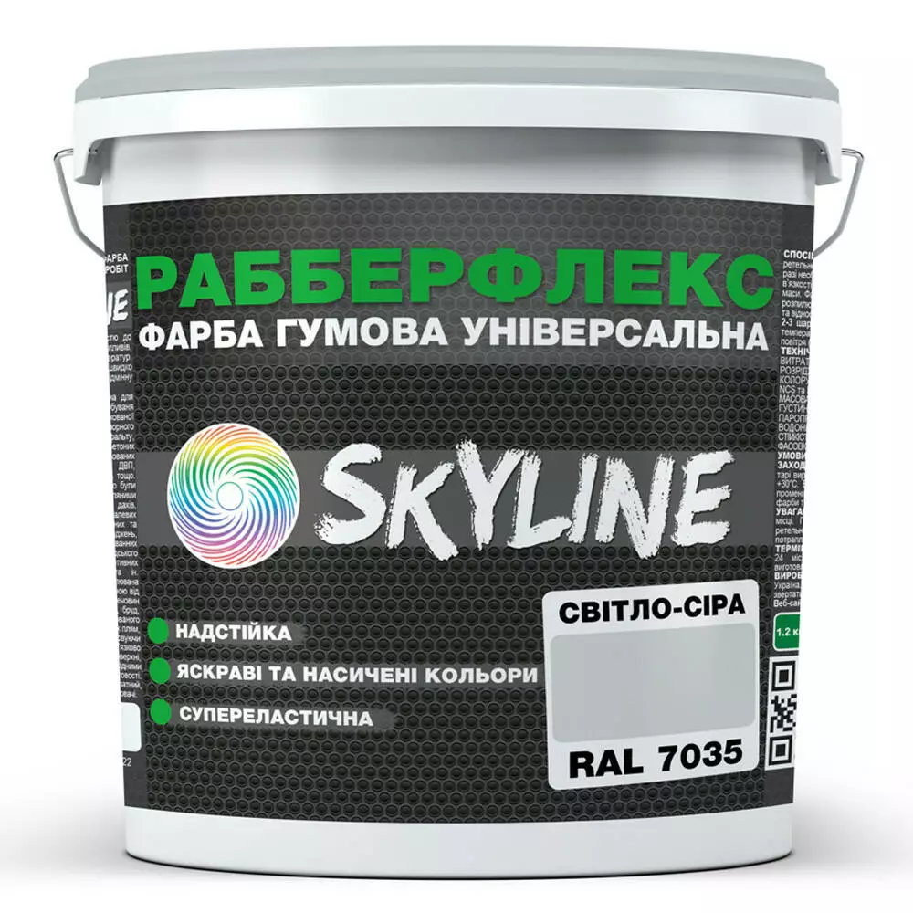 Краска резиновая универсальная «РабберФлекс» СкайЛайн (RubberFlex SkyLine) для применения снаружи и внутри помещений, обладающая повышенной стойкостью к механическим и атмосферным воздействиям, выдерживает любые перепады температур, стойкая к воздействию ультрафиолета и инфракрасного излучения. Обладает высокой паропроницаемостью. Приятна в работе, легко наносится, не растекается и не разбрызгивается. Имеет насыщенную однородную консистенцию. Высокоэластичный материал с отличной адгезией к любым поверхностям.