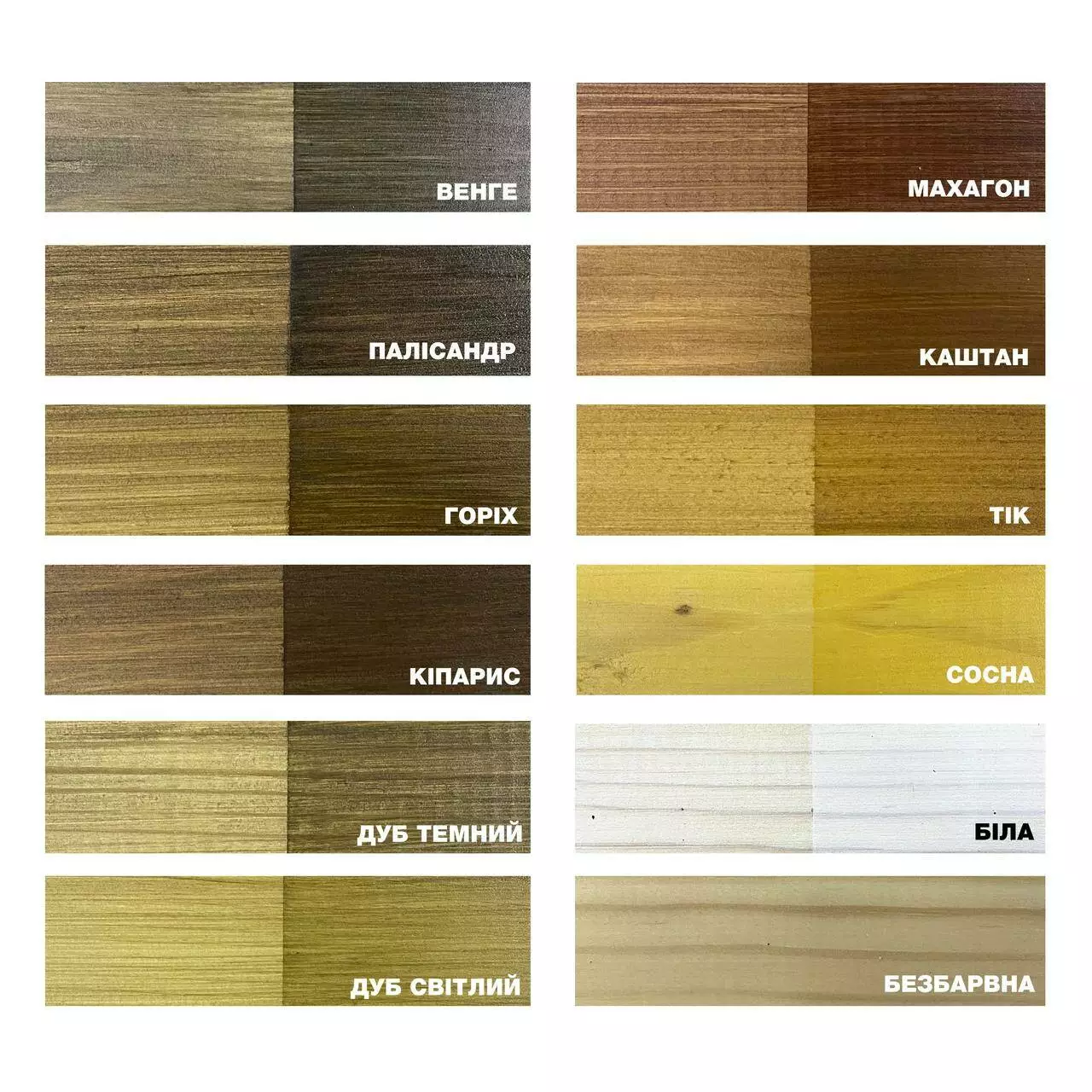 1. Образцы-выкраски цветов, представленных на фото товара - это их фактическое фотоотображение, но на элементах свежей, чистой, зашлифованной сосны, которая имеет однородны цвет, без почернений, пятен, гнили, грибка и прочих дефектов (см. образец Бесцветная). Данный материал тонирующий, то есть он не перекрывает поверхности как краска сплошным слоем, а оставляет видимой структуру древесины и все её видимые особенности. На различных породах дерева материал проявляется по-разному, с учетом всех его физических свойств. Пожалуйста имейте это в виду при выборе цвета и тщательно подготавливайте поверхность перед нанесением.