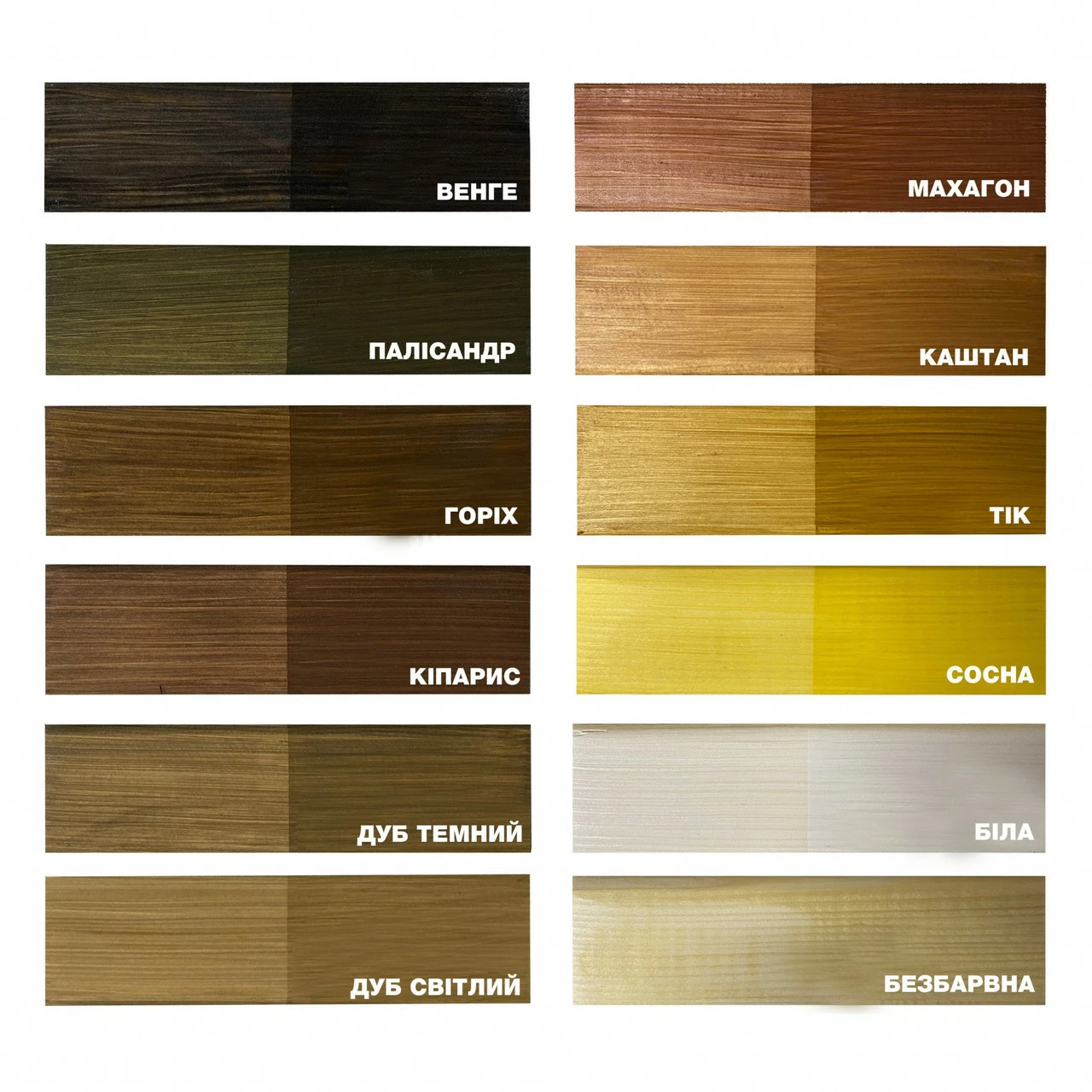 1. Образцы-выкраски цветов, представленных на фото товара - это их фактическое фотоотображение, но на элементах свежей, чистой, зашлифованной сосны, которая имеет однородны цвет, без почернений, пятен, гнили, грибка и прочих дефектов (см. образец Бесцветная). Данный материал тонирующий, то есть он не перекрывает поверхности как краска сплошным слоем, а оставляет видимой структуру древесины и все её видимые особенности. На различных породах дерева материал проявляется по-разному, с учетом всех его физических свойств. Пожалуйста имейте это в виду при выборе цвета и тщательно подготавливайте поверхность перед нанесением.