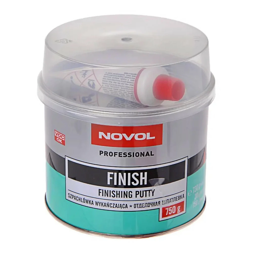 Отделочная шпатлёвка, предназначенная для нанесения шпателем. Служит для ремонта небольших поверхностей и окончательного выравнивания поверхности перед нанесением грунтов. Состоит из двух компонентов. Первый – основной – дисперсия соответствующих наполнителей и пигментов в ненасыщенной полиэфирной смоле, светло-пепельного цвета. Второй компонент – отвердитель – вызывает полимеризацию. Благодаря мелким наполнителям финишная шпаклевка Novol идеально наносится тонкими слоями и заполняет мелкие углубления и царапины. Делает возможной обработку мелкозернистыми наждачными бумагами, в результате чего достигается очень гладкая поверхность. Обладает прекрасной адгезией к разным видам оснований, в том числе к оцинкованной стали.