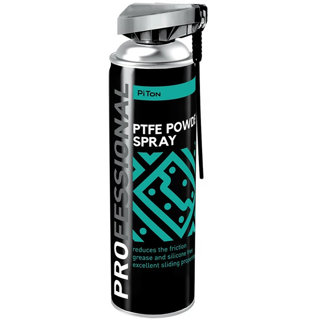 PTFE POWDER SPRAY Piton — специальная сухая смазка на основе PTFE (тефлона). Рекомендуется для обработки механизмов транспортировочных роликов, ремней, сдвижных крыш в авто, сидений, дверных петель и замков, раздвижных дверей, оконных механизмов и замков, мебельных механизмов и направляющих, подшипников и т.п. Для использования в автомобилях, автобусах, сельскохозяйственной и садовой технике, промышленности и быту. Применяется на поверхностях, где нежелательно использовать жидкие масла. Образует на поверхности сухую пленку. Устранение скрипов, возникающих при контакте любых материалов. Можно использовать в качестве разделяющего средства для форм, в которых не используется силикон.